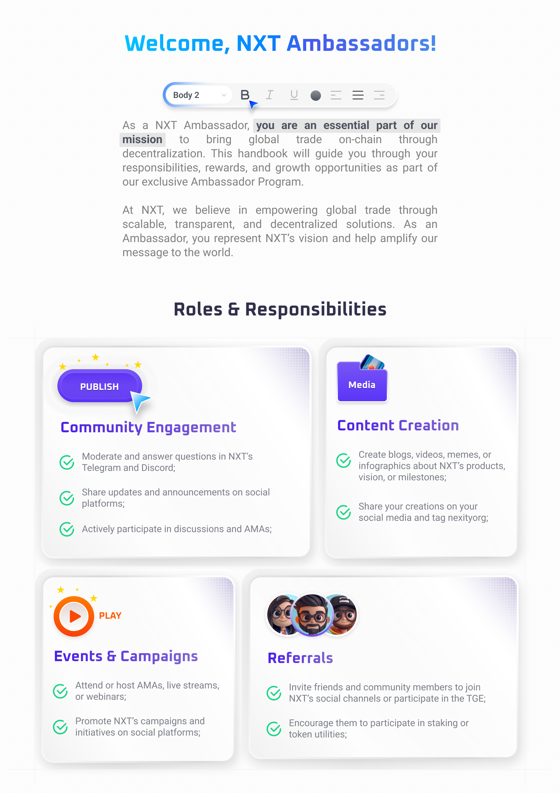 The NXT Ambassador Program is your gateway to actively shaping the future of decentralized trade. This initiative is designed for those who believe in the power of blockchain and want to play a role in bringing real-world finance on-chain.