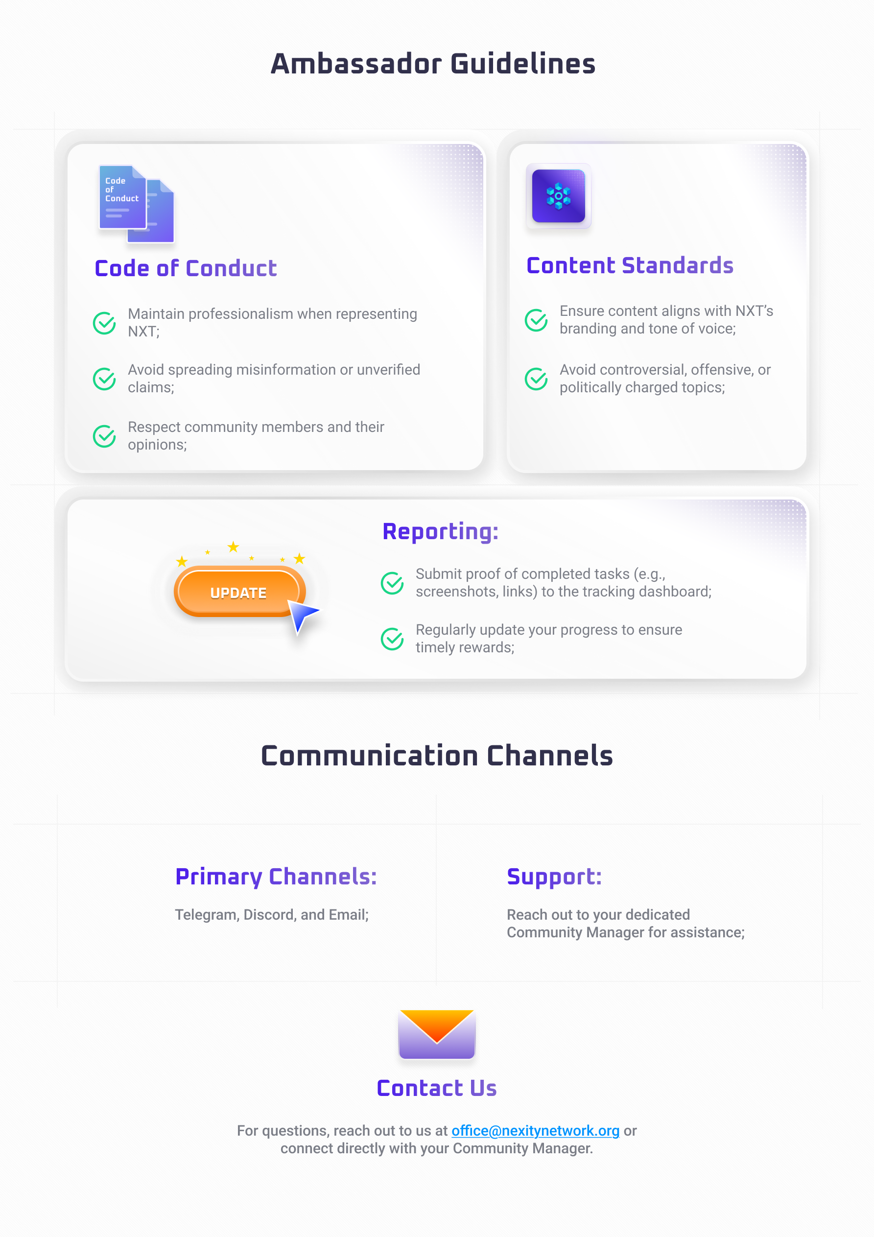As an ambassador, you will help moderate and participate in NXT’s social channels, including Telegram, Discord, and Twitter. You’ll play a crucial role in: